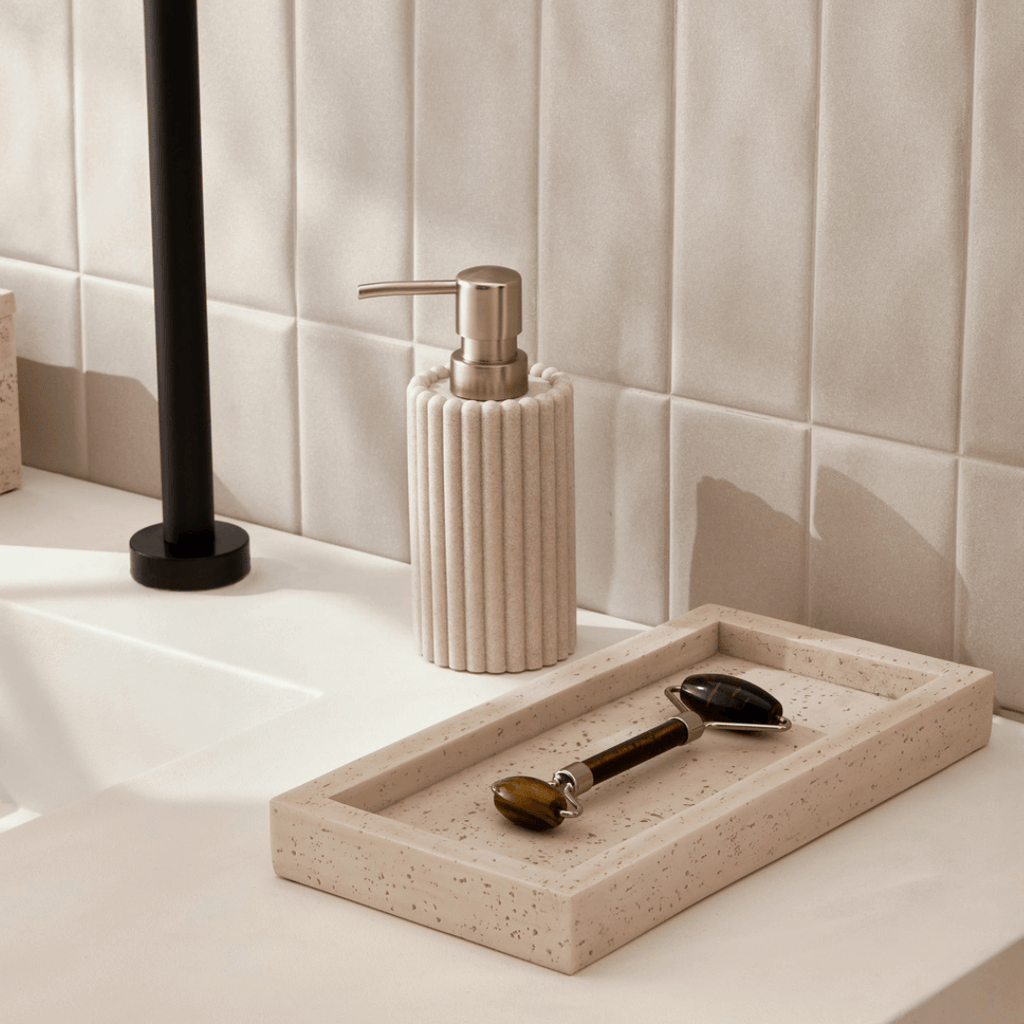 Este kit para banheiro em polirresina canelado de 3 peças é perfeito para adicionar um toque elegante e moderno ao seu banheiro. Feito de material resistente, o kit inclui um dispenser de sabonete líquido, porta escovas de dentes e uma bandeja