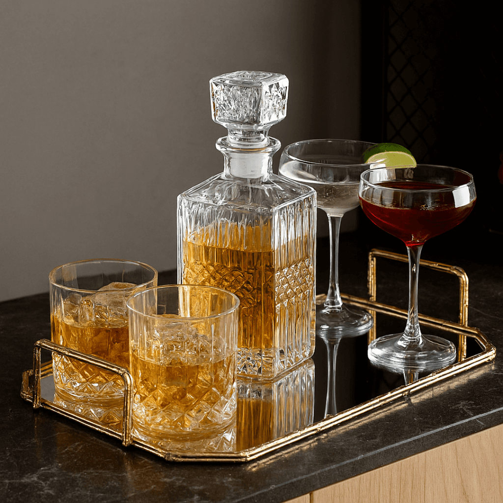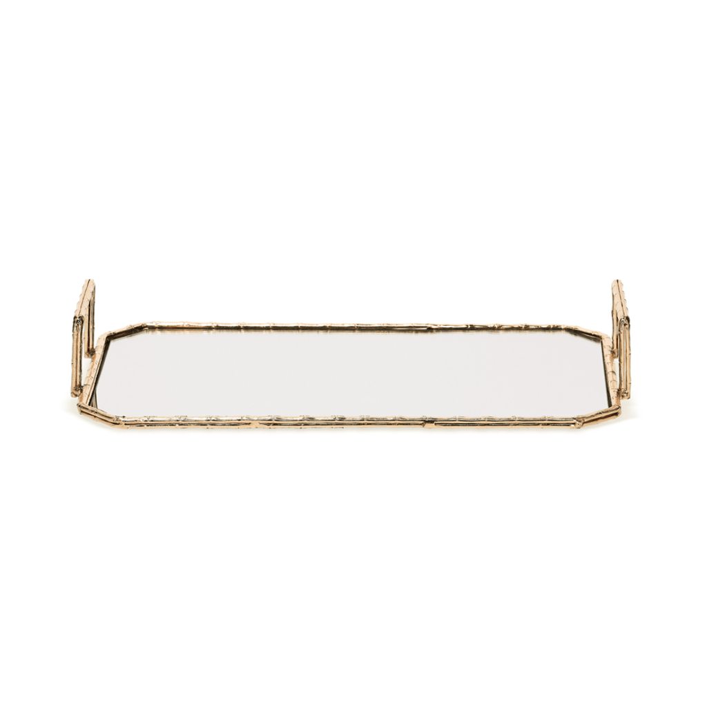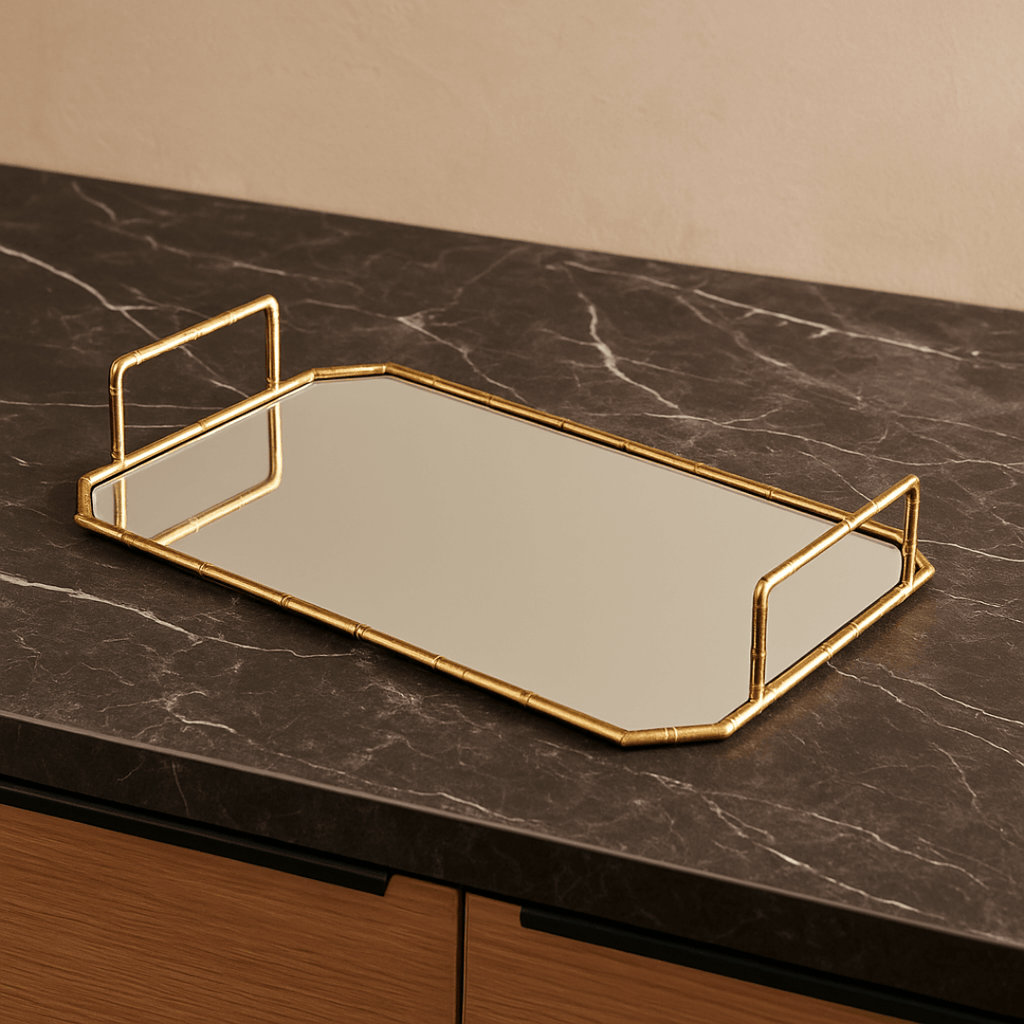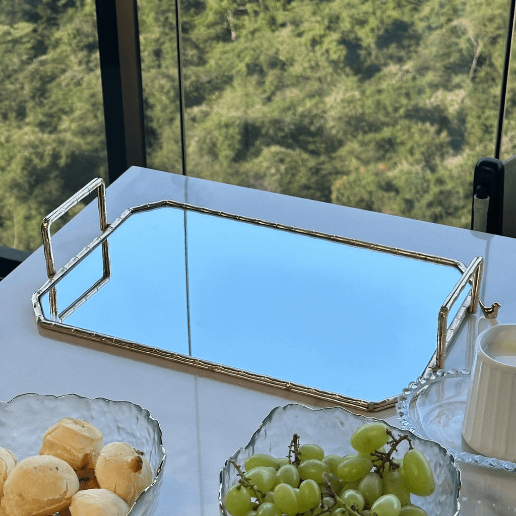 A Bandeja em Metal Dourada com Espelho P 39,5cm é a escolha perfeita para quem deseja adicionar um toque de elegância à decoração com praticidade.