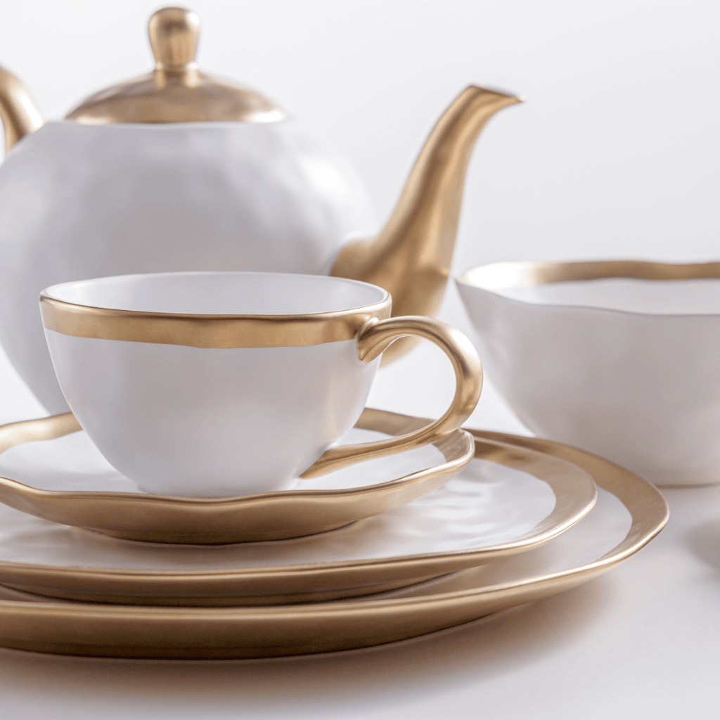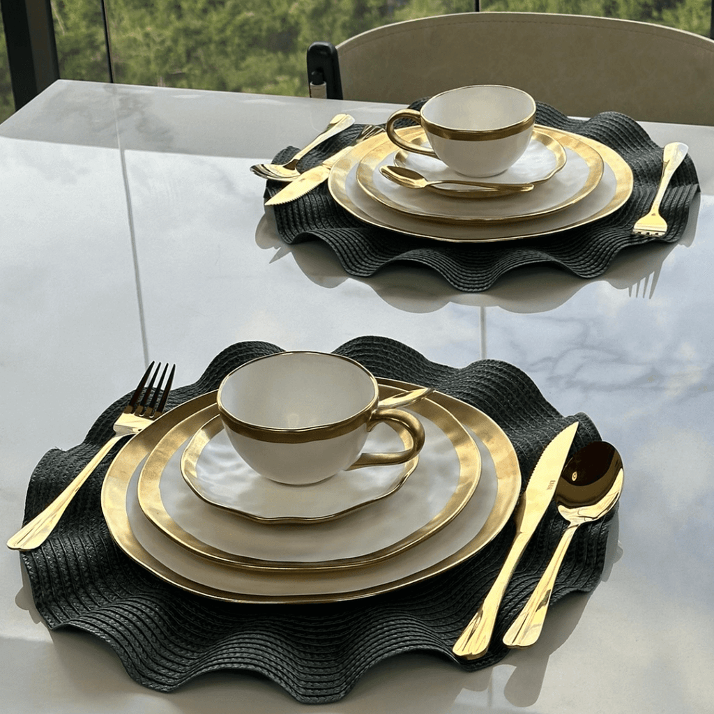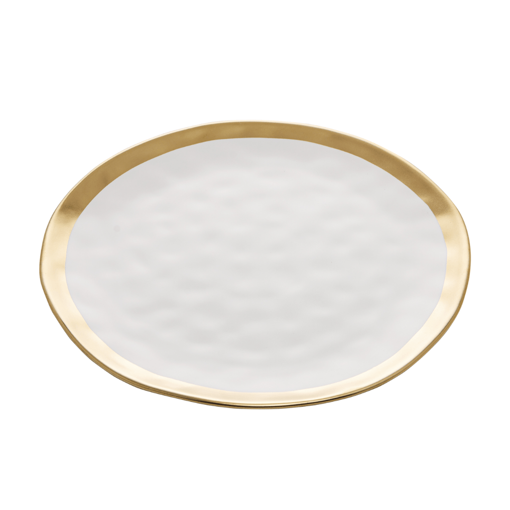 Transforme suas refeições em verdadeiras experiências refinadas com o Prato Raso de Porcelana Dubai Branco e Dourado 25cm.